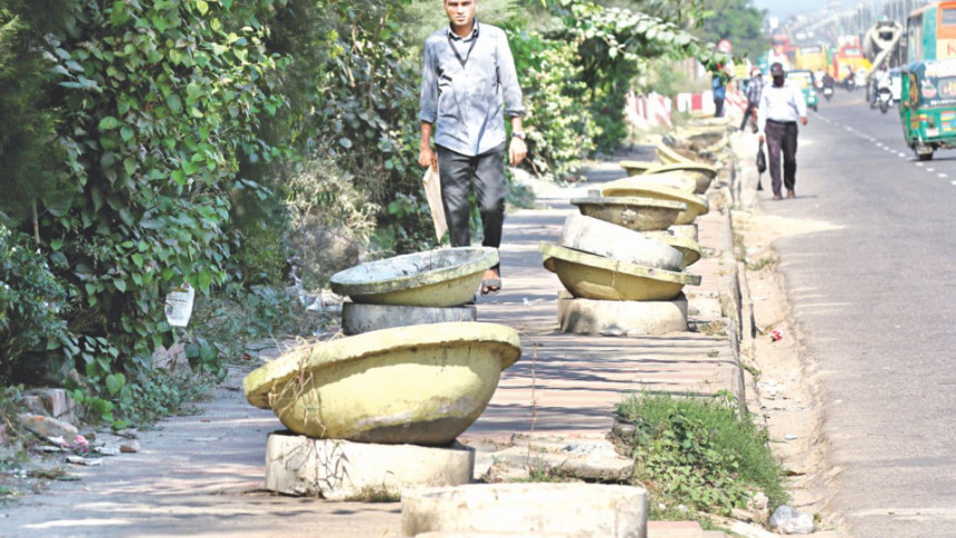 Flower pots on a footpath near Banani Bus Stand left haphazardly. The pictures were taken in the last two days. Photo: Prabir Das/Palash Khan