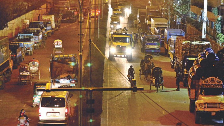 Trucks illegally park on a street near Tejgaon, which was cleared off parking after a drive by the late mayor in 2015. Photo: Prabir Das/Palash Khan
